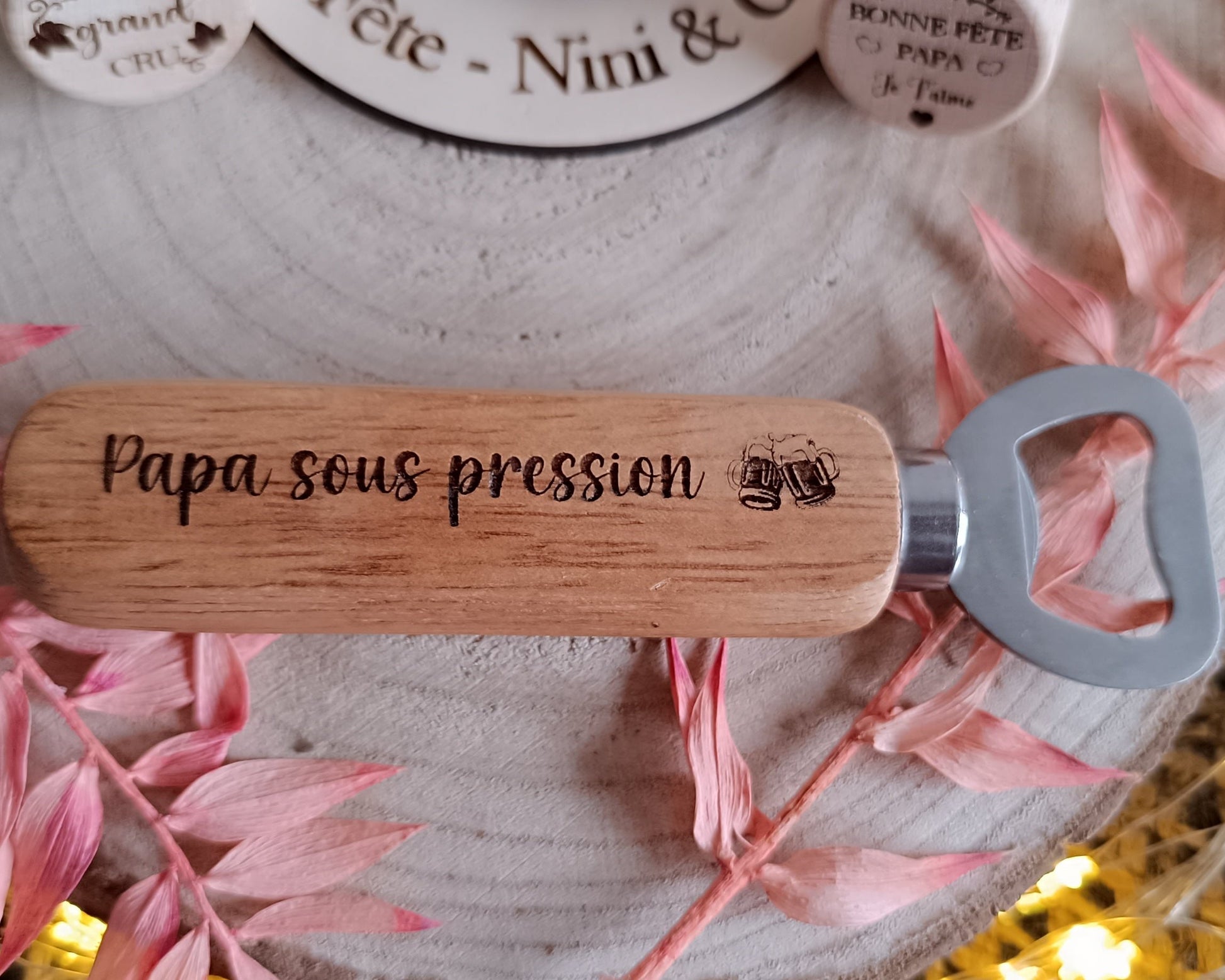 Décapsuleur en bois gravé